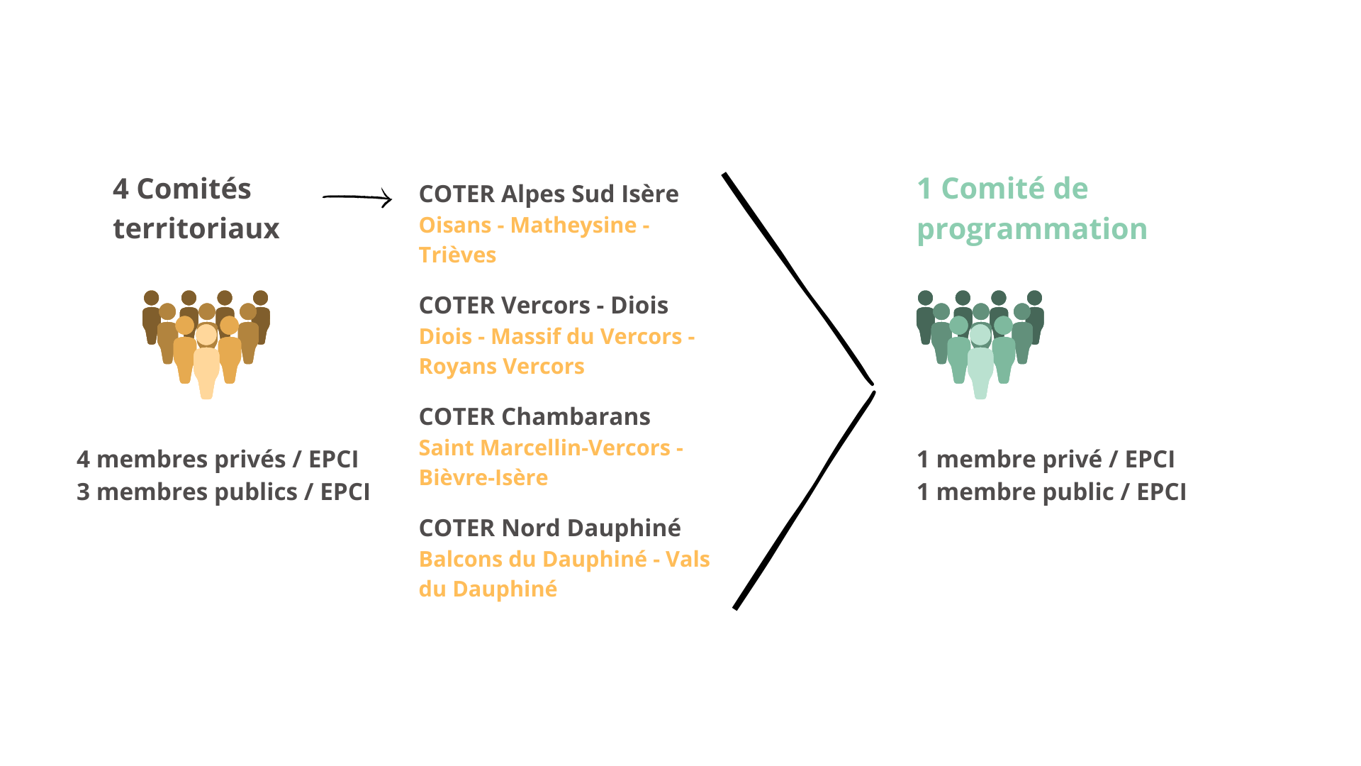 Le GAL Terres de Dauphiné est animé par deux types de comités dépendants l’un de l’autre : les comités territoriaux (au nombre de 4) et le comité de programmation.